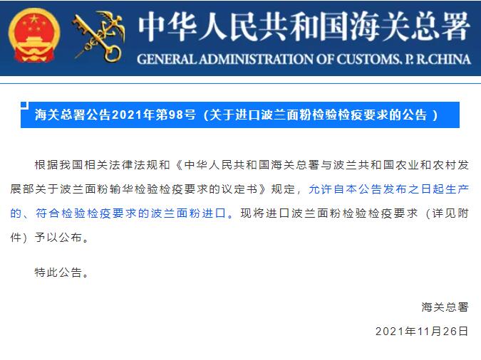 2021年11月26日,海關(guān)總署公布2021年第98號公告:允許自本公告發(fā)布之日起生產(chǎn)的、符合檢驗(yàn)檢疫要求的波蘭面粉進(jìn)口。