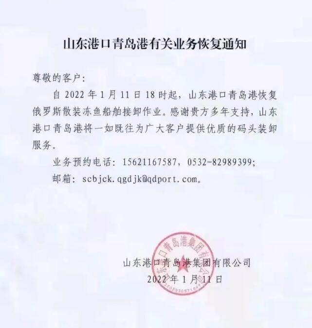 “青島港于1月11日下午6:00恢復俄羅斯凍魚船的取卸業務,”港口管理公司山東港青島港集團宣布。