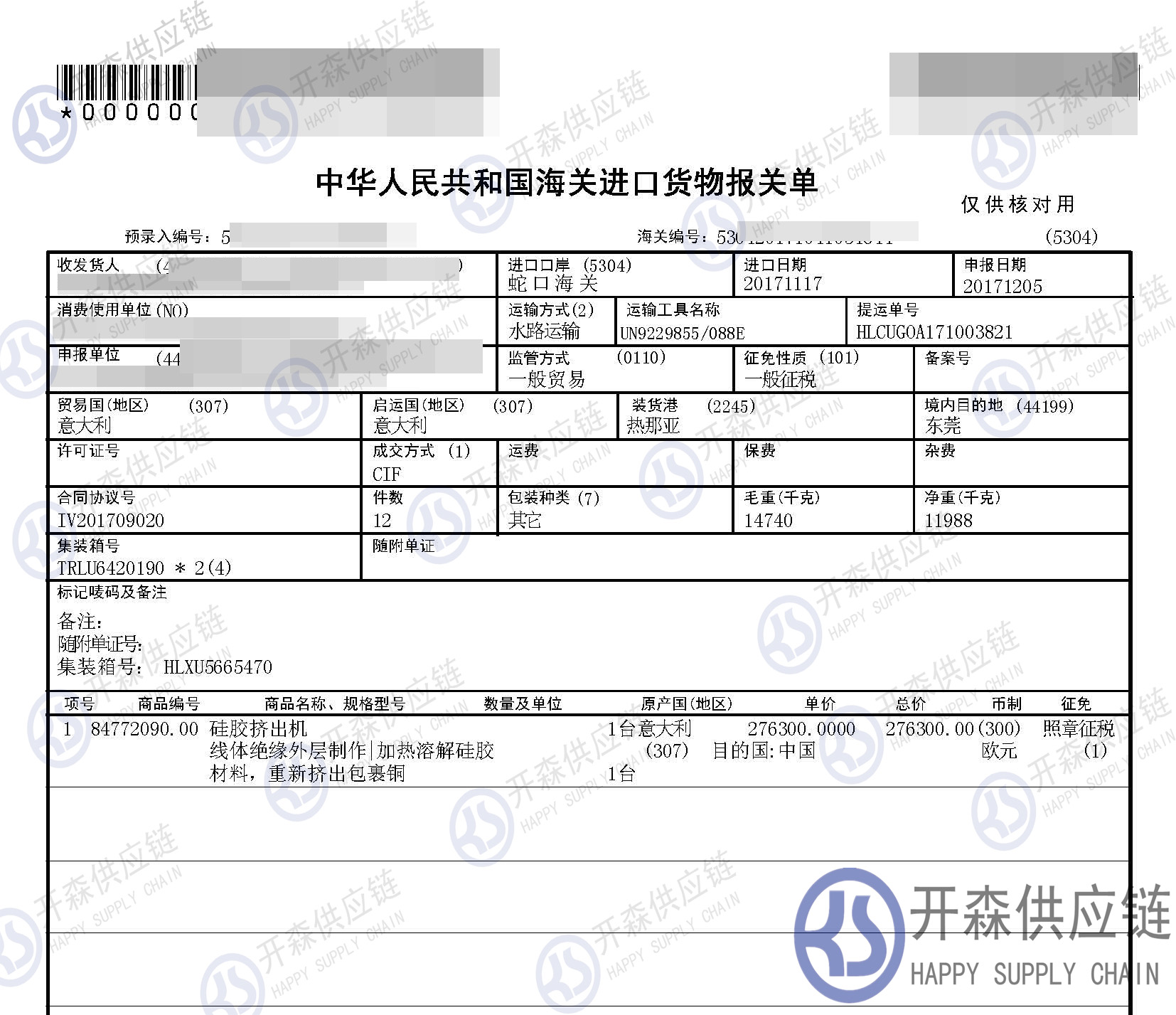 從意大利進(jìn)口一臺(tái)硅膠擠出機(jī)到深圳蛇口碼頭,我司提供門到門機(jī)械設(shè)備進(jìn)口一站式清關(guān)服務(wù),開森擁有十余年二手機(jī)械設(shè)備進(jìn)口清關(guān)經(jīng)驗(yàn)及案例,為客戶提供量身制作的進(jìn)口方案,讓客戶進(jìn)口省時(shí)省心省成本。