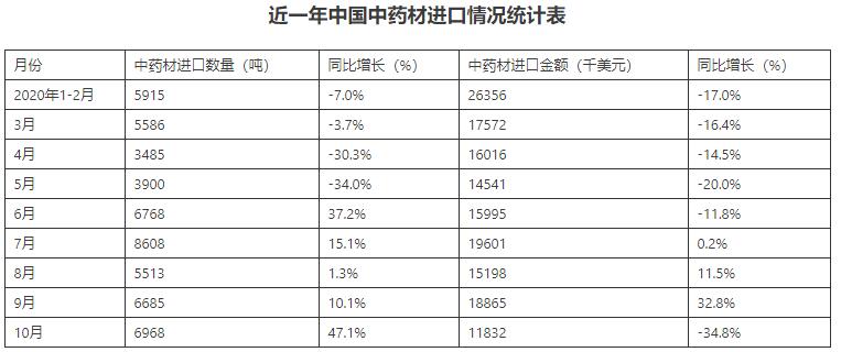 2020年1-10月中國中藥材進(jìn)口數(shù)量為53428噸,增幅為3.3%;進(jìn)口金額為155981千美元,降幅為10%;2020年1-10月中國中藥材進(jìn)口均價為2.92千美元/噸。
